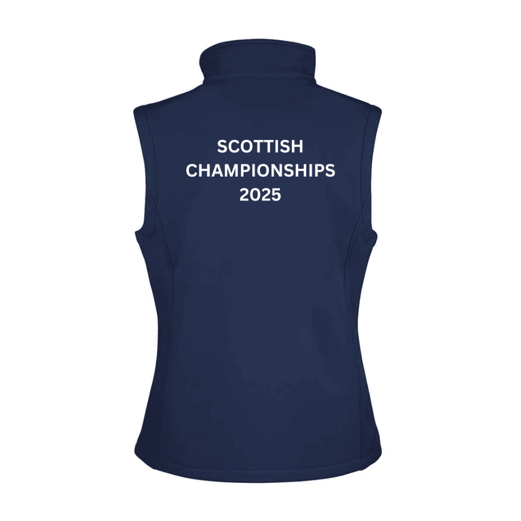 Navy, ladies’ semi-fitted softshell gilet. Micro fleece lined and functional this showerproof gilet features an embroidered British Dressage regional logo, in white thread on the front breast as standard. Option to have your name embroidered to the front &/or a Scottish Championships text print added by selecting the additional extras tick boxes.