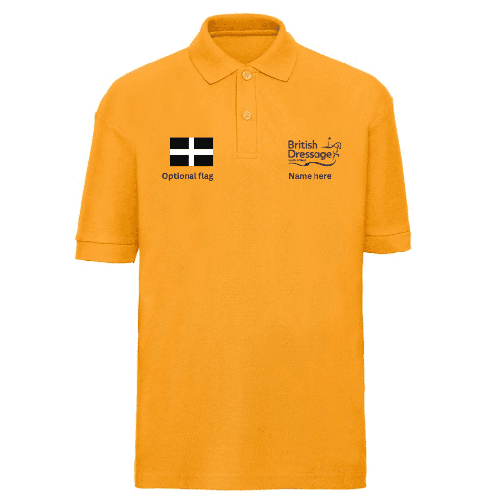 Children’s poly cotton polo shirt with rider name and the S&W regional logo embroidered to the front, along with S&W County Team Rider print to the back as standard—option to add your county flag embroidered on the front by selecting the additional extras tick box. (please specify your county)